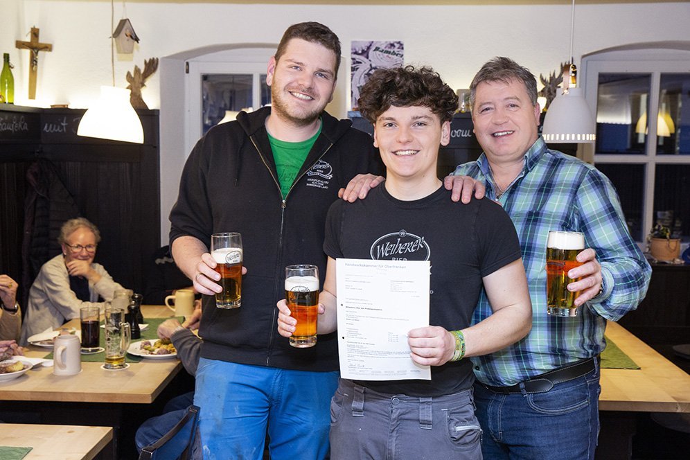 Nella foto: Si congratulano con David (al centro) per il risultato eccellente: i mastri birrai Michael Popp (a sinistra) e Roland Kundmüller.