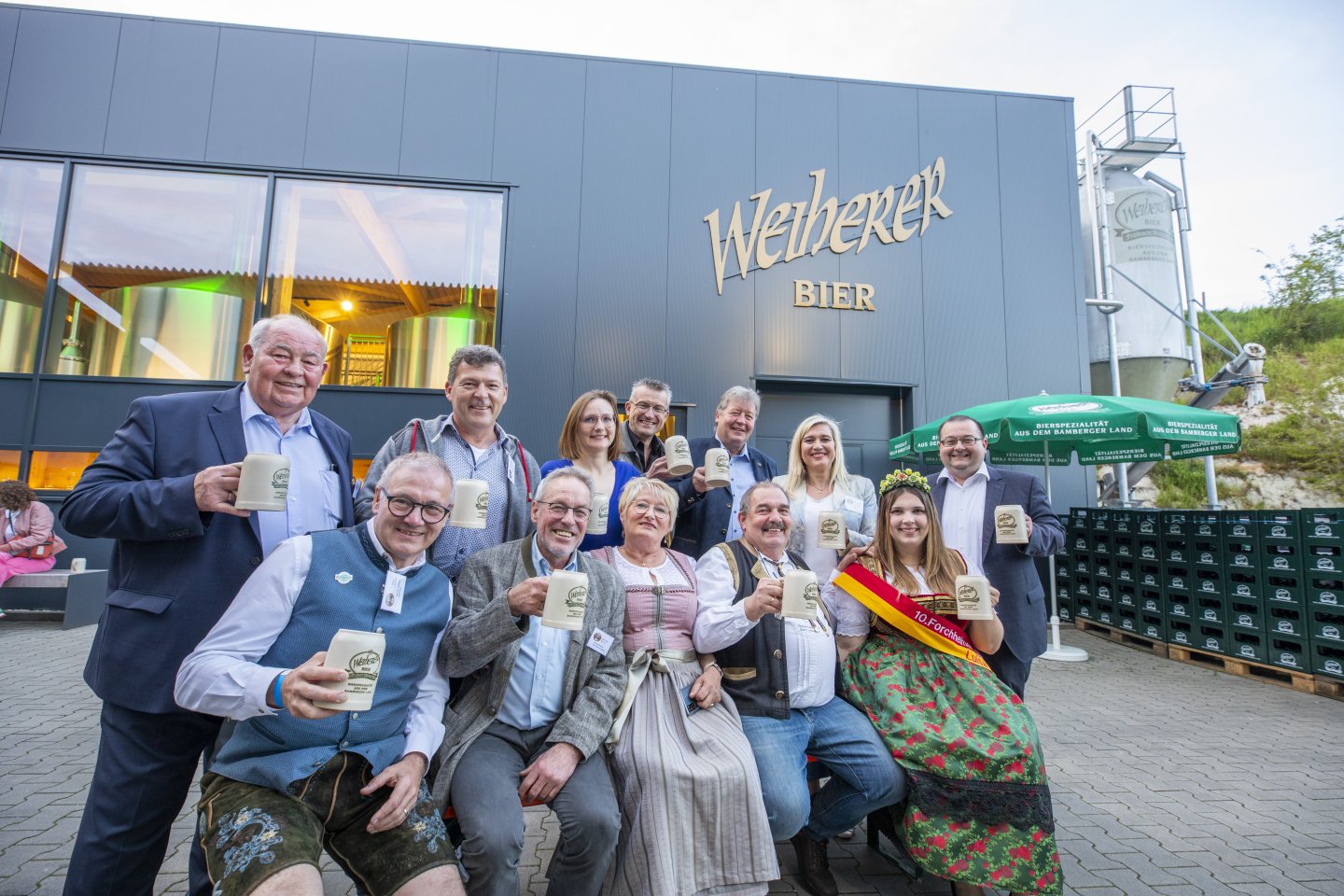 BU: Feierten 70 Jahre Georg Lechner (v. 4. v.l.): hinten (v.l.): Konrad Göller, Vorsitzender Hospizverein Bamberg, Carsten Joneitis, Bürgermeister der Gemeinde Oberhaid, Lisa Badum, MdB und Vorsitzende Parlamentskreis Braukultur, Oswald und Roland Kundmüller, Staatsministerin Melanie Huml, Thomas Söder, Bürgermeister der Stadt Hallstadt. Vorne (v.l.): Georg Rittmeyer, Präsident Private Brauereien Bayern, Michael Knab, Vorsitzender Brauereimuseum Bamberg, Lucja Lechner und die Forchheimer Bierkönigin Luisa Zametzer
