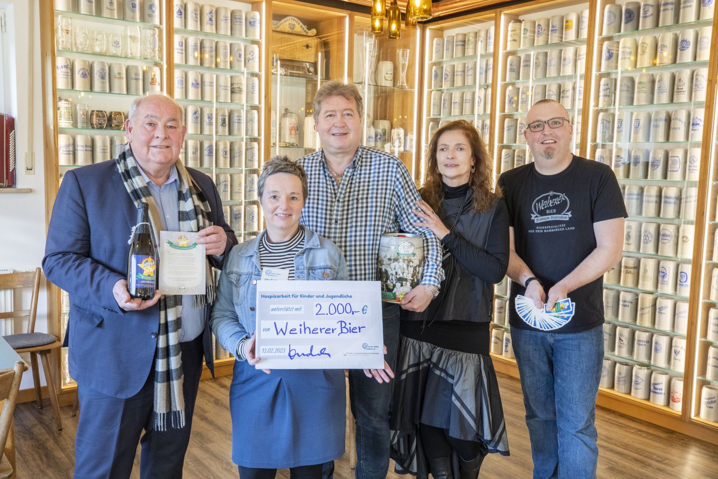 BU: Während Roland und Heike Kundmüller (3 u. 4. v.l.) die 2000 Euro Spende an Konrad Göller (l.) und Silke Kastner vom Hospizverein Bamberg überreichten, freut sich Andreas Nüsslein (r.) bereits darauf bei den kommenden Weiherer Taubenmärkten erneut Spenden für das Kinderhospiz Sternenzelt sammeln zu können.