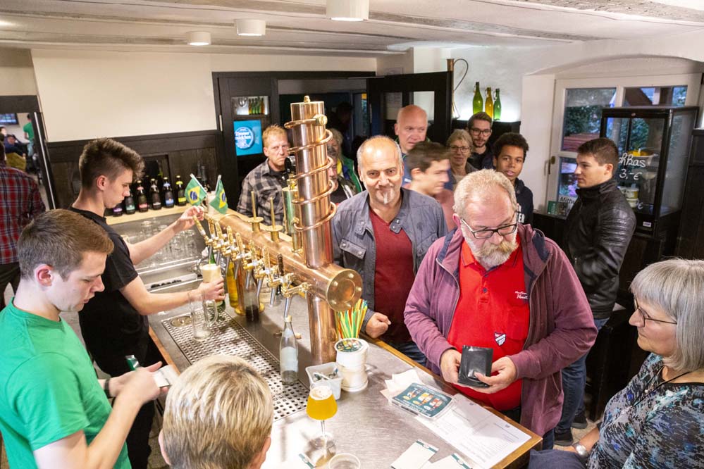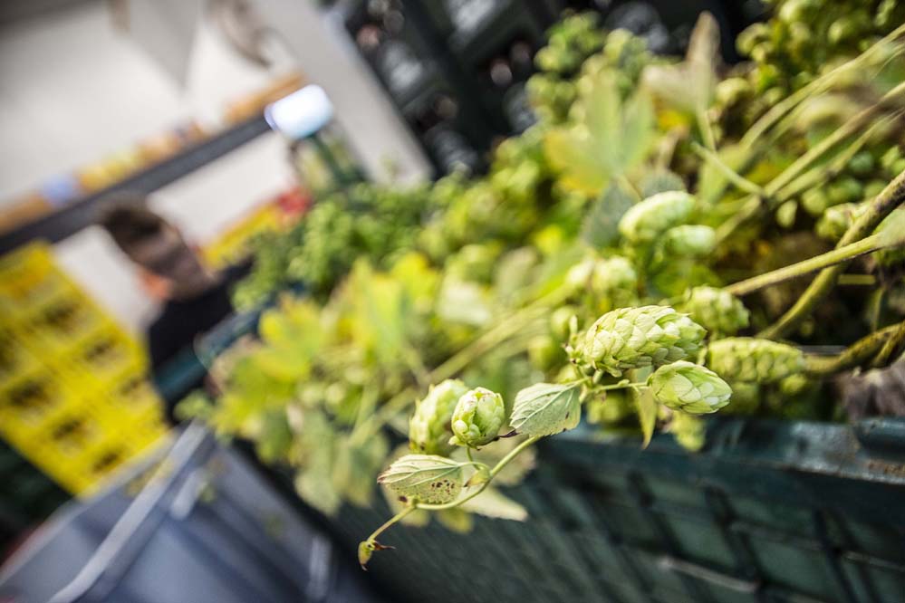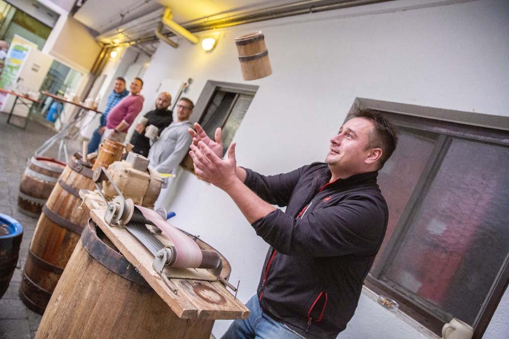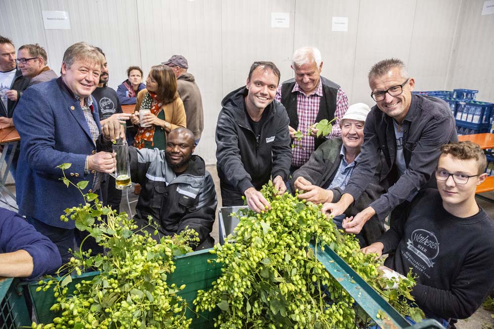 Johann Pfister, rappresentante del Landrat, assieme ad Alexandre Bazzo e ai fratelli Kundmüller hanno raccolto il luppolo fresco, che hanno poi aggiunto tutti insieme al mosto. “Il clou della serata”, così Oswald Kundmüller.